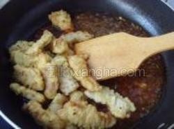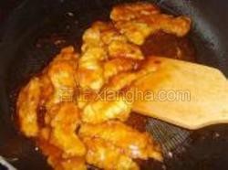 9.烹入糖醋味汁,倒入里脊条翻炒均匀。