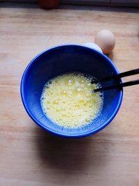 鸡蛋磕出,用力搅打,直到停下来发现蛋液面全部布满泡泡,足够蓬松才可。西红柿炒鸡蛋其中一个关键就是但是否软嫩有弹性,所以打发鸡蛋的时候要多费些力气哦~~