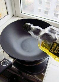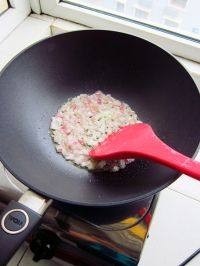 入洋葱碎中小火慢慢煸透,煸香。将煸炒的完全透明的洋葱碎捞出不要,只留葱油