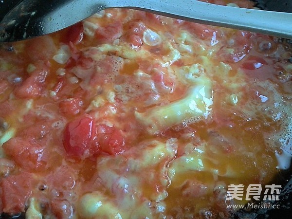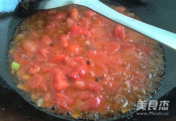 热油爆香葱花,倒入西红柿块炒出汤汁