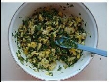 将鸡蛋和切碎的花椒叶放在盆中,倒入适量炸好的花椒油。(注意花椒粒不要倒入馅中),加入适量盐调味