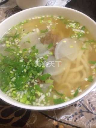 面条要捞到稍大些的碗中,放入香菜末蒜苗末和牛肉块,舀入足量的拉面汤,美味的拉面就好了。