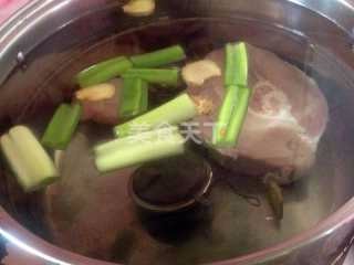 泡好的牛肉加入一个生鸡翅根,放入调料、葱段和姜片,锅中倒满凉水开始煮肉。要先大火将水烧开,撇去浮沫,将火转至最小,液面将沸不沸的状态煮4-5小时。