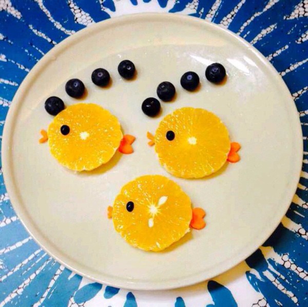 将橙子切片,胡萝卜切丁,与蓝莓一起拼盘