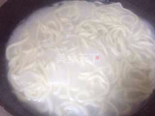 拉面:醒好的面片(约需2小时)切成约1cm宽细条,锅中倒足量开水,一根根将面拉入锅中。