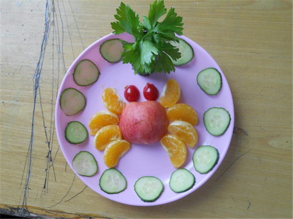 黄瓜切片、苹果切开,圣女果切两半,橘子剥开,按照图示拼盘