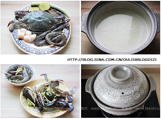 螃蟹清洗干净,揭去蟹壳,去掉鳃切成小块,鲜虾清洗干净挑去虾线,贝丁清洗干净