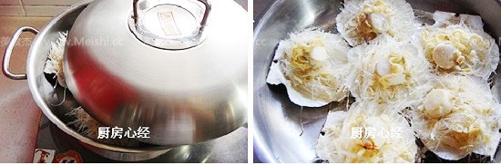 将拌好的蒜粒粉丝铺在扇壳上,再码好贝肉
