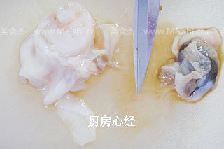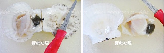 用小刀贴近平面,割断链接肌,打开扇贝,拿下贝肉。保留凸的贝壳,容易塞进粉丝啊
