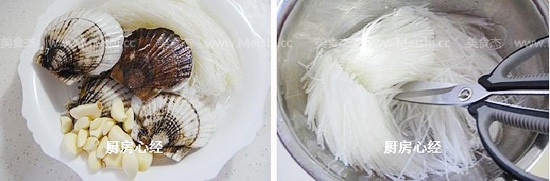 先看看原材料:用刷子将扇贝二面刷洗干净,粉丝提前1小时用凉水泡软,剪断