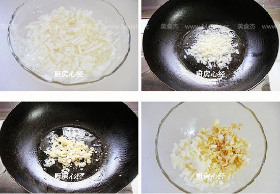 蒜粒一定用清水洗净粘液,取一半下锅炸成金黄色,与另一半白蒜混合