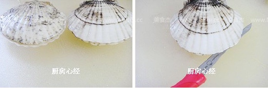 扇贝有一面是平的,另一面是凸的,将平的一面放置于下面备用