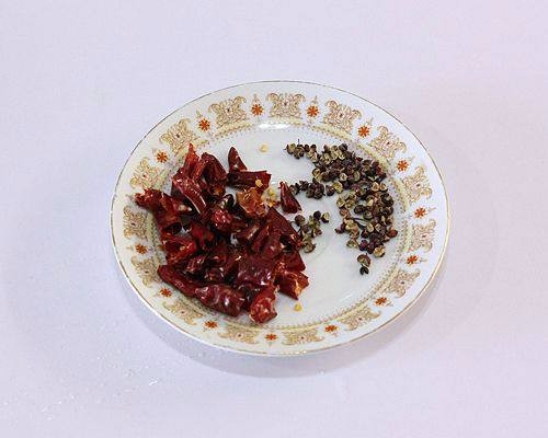 3.干辣椒去蒂去籽,切成1厘米长的节