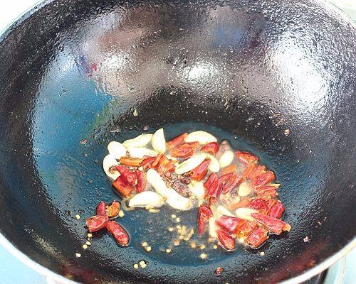 10.炒出香味后放入干辣椒炒至棕红色