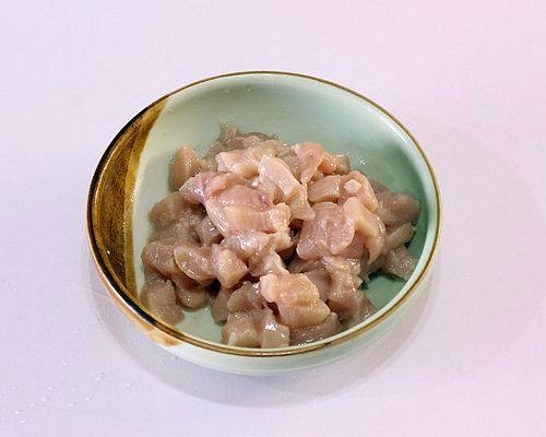 4.鸡肉拍松,再用刀改成小丁