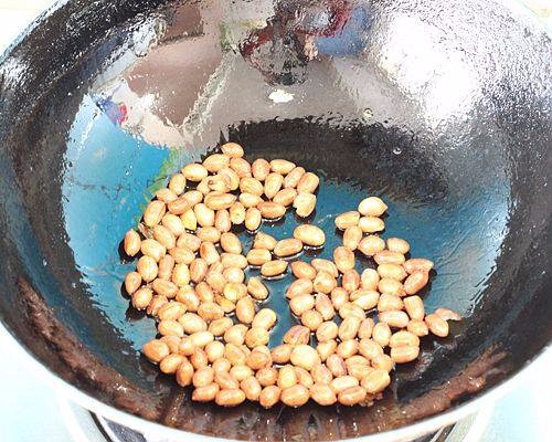 7.捞出冷却。火候控制好,炸过火了花生吃起来有一些苦味。(花生可以去皮,也可以不去,花生的红皮有很好的补血功效,对人体很有好处,但为了做菜好看,很多朋友都去掉了那层红皮。)