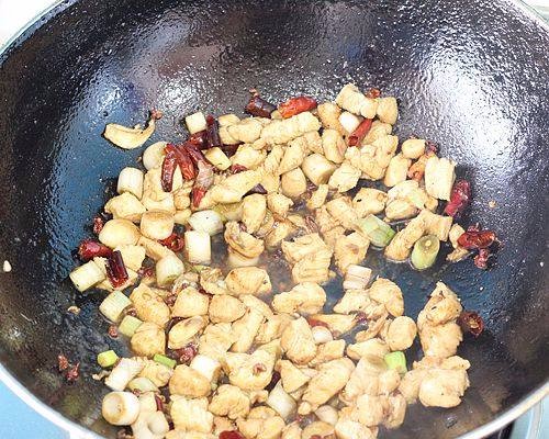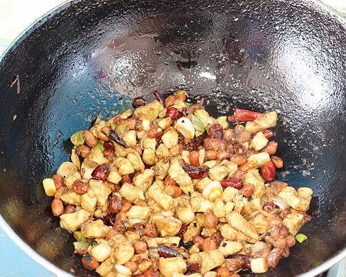 12.随即下入炒变色的鸡丁炒散
