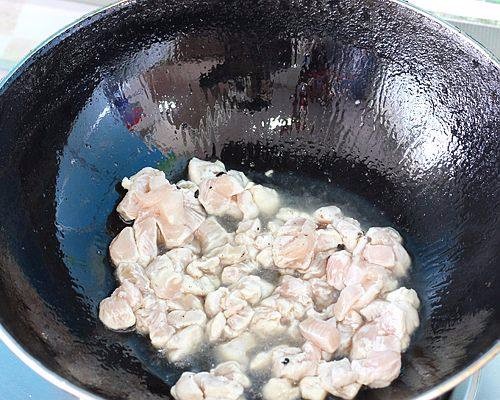 8.烧热锅,下油,烧热将鸡肉入锅炒到变色捞出
