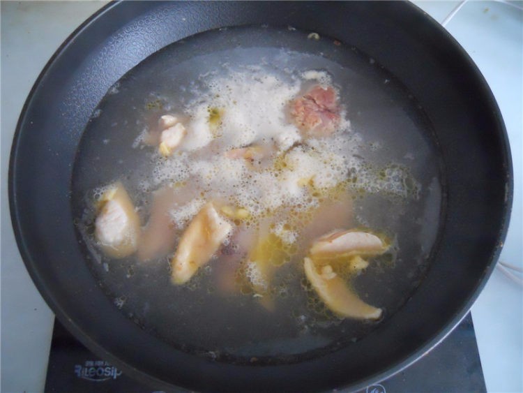 2.冷水下锅,将水煮开,让鸡肉随水温的上长而排出血水与杂质。