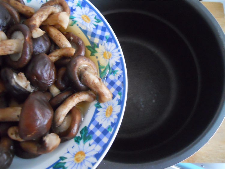9.水沸后,放入香菇焯烫,因为菌类都会有些毒性,而且香菇不容易洗净缝隙里的残渣,所以焯烫一下吃会更安全也卫生。