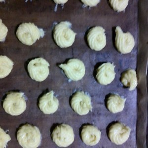 装入裱花袋中,在烤盘中挤成圆卷状花型。在中心处按上葡萄干。入烤箱200度,15分钟。