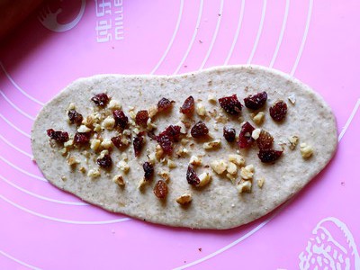 发酵好的面团揉压排气.分成5到6等份,然后擀成长椭圆形把蔓越莓干撒上