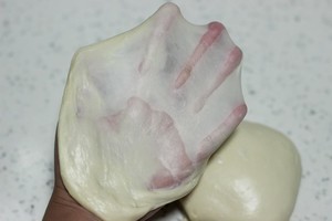 除黄油外的所有面团材料揉光滑后加入黄油揉至完全阶段。(取一小块面团用手指撑开有坚韧的不易破薄膜即可)