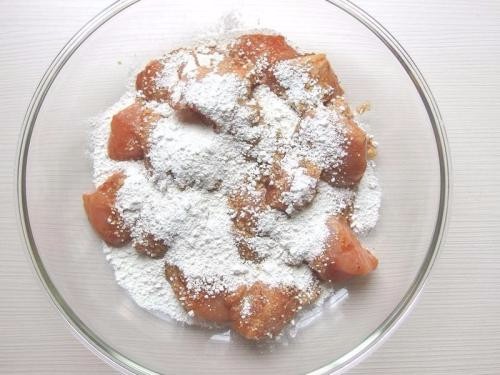 将原料完全解冻后、完全沥干待用。部分油炸原料需改刀,在表皮上轻划几刀。(如:鸡大腿、翅中等)放入预先调制好的腌渍料中,(鸡块 :腌料 :料酒=100g:10g:20g ),正常腌渍2-3小时左右,腌料是味好美牌的香辣炸鸡粉(其他牌子也可以)