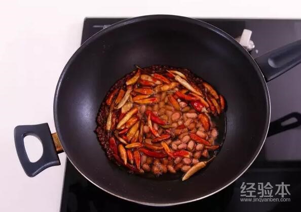 在锅中加入食用油、花生、干辣椒、辣椒粉炒熟,作为酱汁