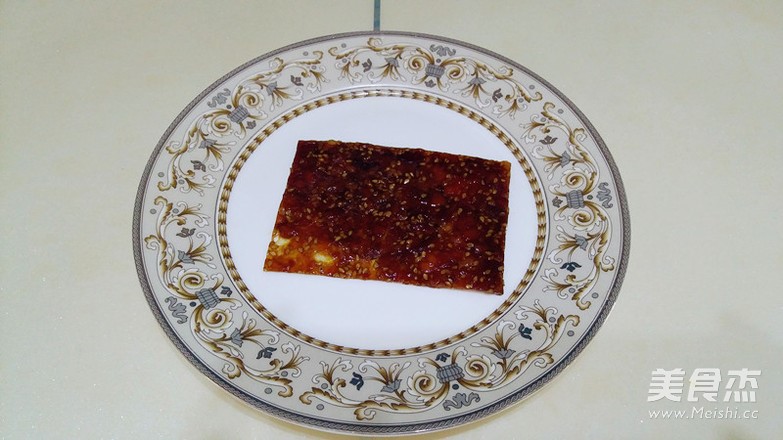在烤肉脯的空档,调蜂蜜水=将2勺蜂蜜加适量水,搅成稀稀的蜂蜜水,备用 烤好的肉脯,刷上蜂蜜水,送入烤箱,上下火130度5分钟,取出盖上一层油纸,翻转到烤架上