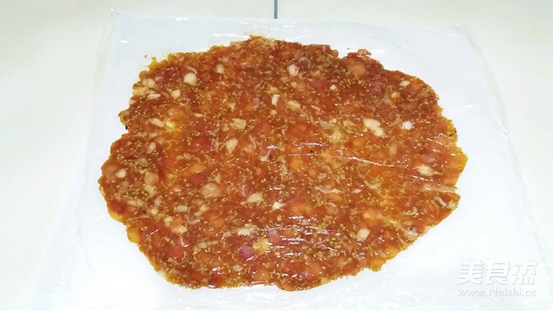取一半的肉馅放在硅油纸上,表面覆一层保鲜膜,用擀面杖敲开,敲+擀成薄薄一片,尽量薄一些 现成的肉馅有肥肉影响了整体效果,肥肉是硬的,擀劲大了,不小心就会有空隙,可以更薄的