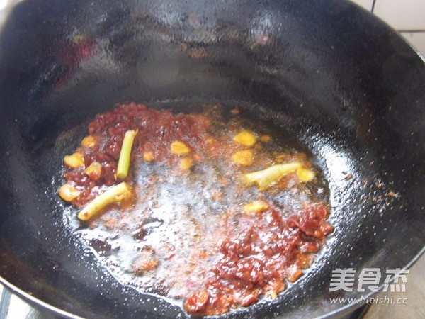 炒锅放入2汤匙菜籽油加入豆瓣酱、姜末、葱段炒出红油