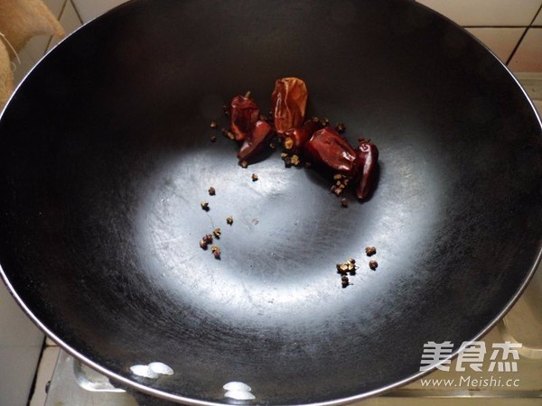 炒锅下入干花椒和干辣椒小火培香成棕红色后,捞出剁碎备用,不需要太碎