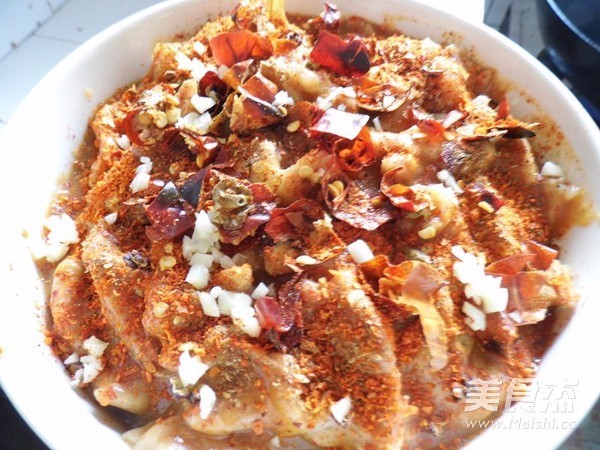 将煮好的肉片倒入容器里,将剁碎的花椒、辣椒碎、辣椒粉、花椒粉、蒜末撒在肉片上