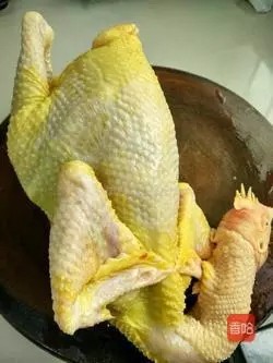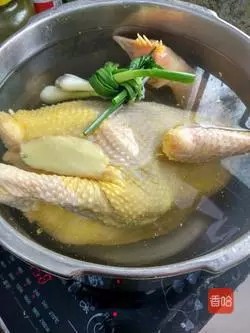 鸡煮七成熟关火热汤里浸泡25分钟,途中要翻动一下使鸡均匀受热