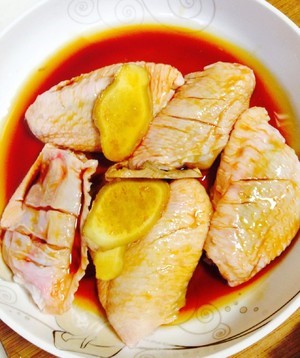 加入料酒和酱油,放几片姜与蒜片腌制鸡翅三个小时。