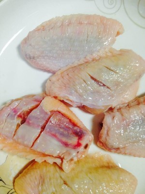 将鸡翅斜割几刀,背面用牙签扎几下,提前腌制更加入味。