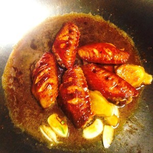 将之前腌制的料倒入,加水没过鸡翅,中火十五分钟,加入少量蜂蜜水,大火将汤汁收干,摆盘。