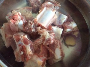 切好排骨 用水洗两遍 一定要洗干净 在锅里放入凉水 再放入洗净的排骨 加几片姜片开火焯一下