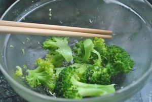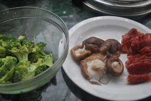 把西兰花和香菇在沸水中焯熟,拌上盐和麻油