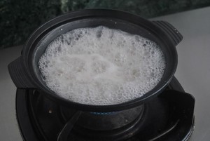 浸泡大米半天左右。在煲仔锅内壁抹上一层油。放入浸泡好的大米和水。小火慢煮