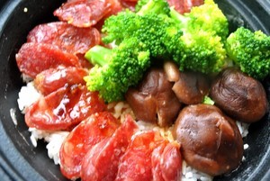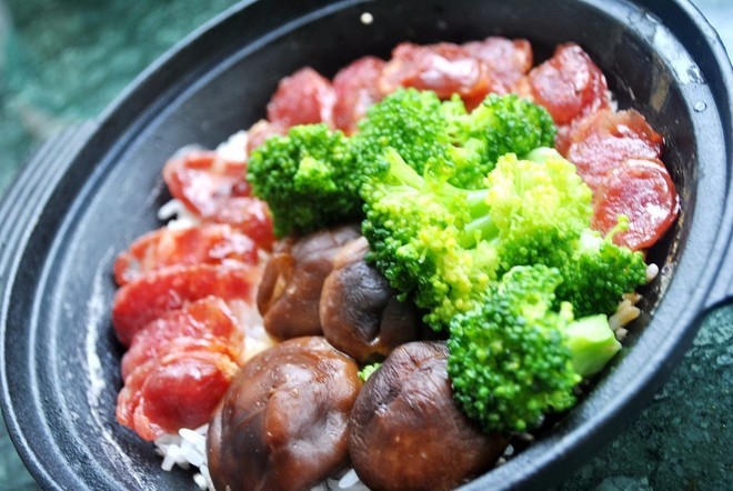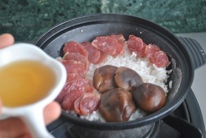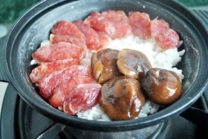 这个时候饭差不多快好了,把切好的腊肠和香菇码上去。再小火焖煮一会