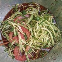 4. 在切好的菜里,加入盐,味精,酱油,白糖,白醋,冷面料搅拌均匀。白糖和盐要多放一些