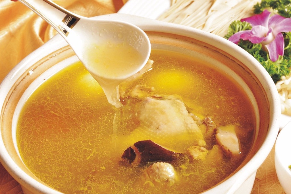三黄鸡一只去干净内脏和毛整只放入锅中焯水去血污,锅(最好是砂锅)中重新加入冷水,加入鸡加入适量葱段,姜片料酒熬制一个半小时,不断的撇去浮末使汤汁更清亮。得到鸡汤一碗。