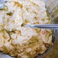 10. 将韭菜碎、虾仁粒、生姜末一起放入鸡蛋块盆中。
