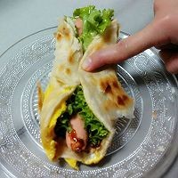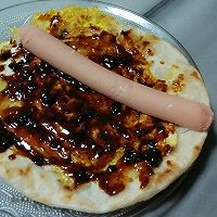 13. 烙好的饼上抹酱,放火腿肠,放生菜。