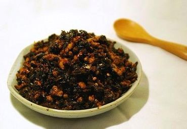 炸花生米的油留在锅中,倒入碎米芽菜50克,肉沫50克,姜蒜切末,肉沫炒香后加碎米芽菜和姜蒜末