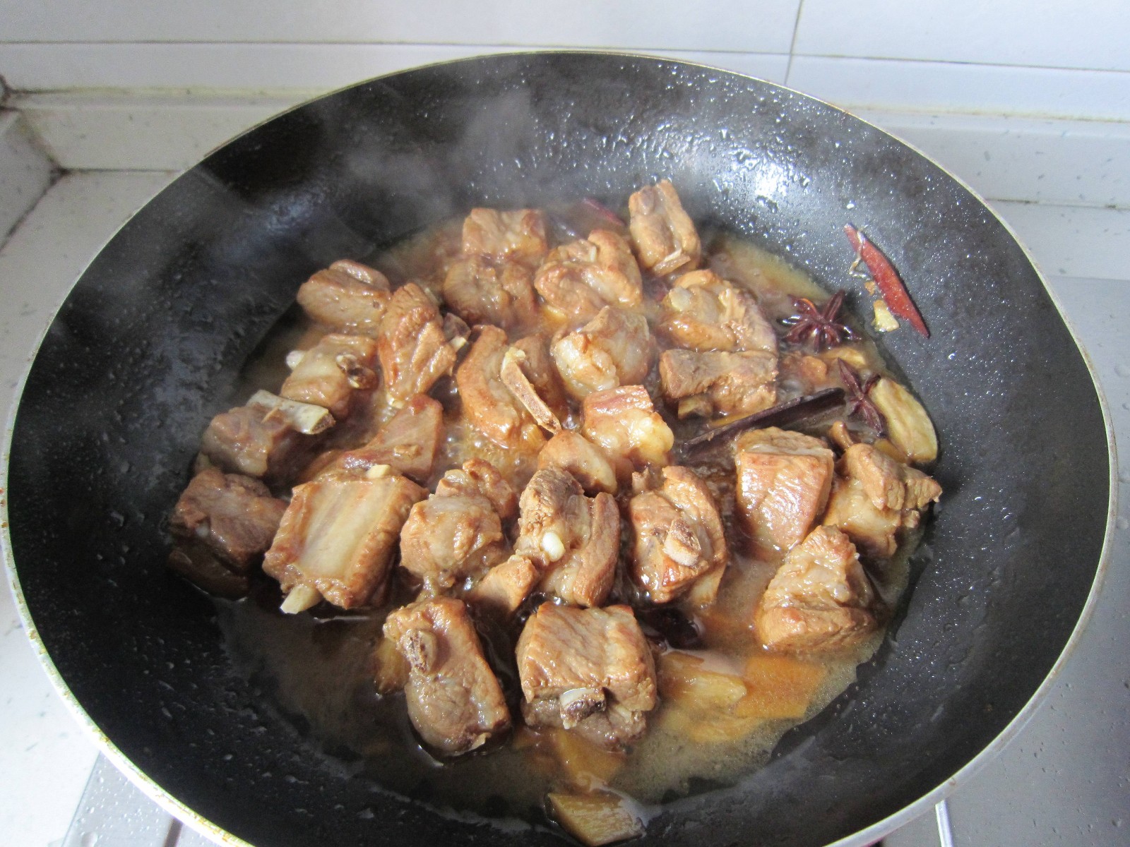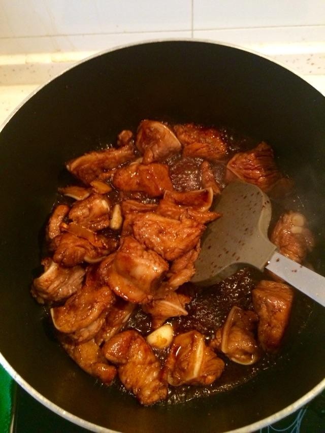 锅内放排骨,腌排骨的水,三汤勺白糖(大胆的放糖吧,三汤匙,别怕多)。半碗肉汤大火烧开,调入半茶匙盐提味。