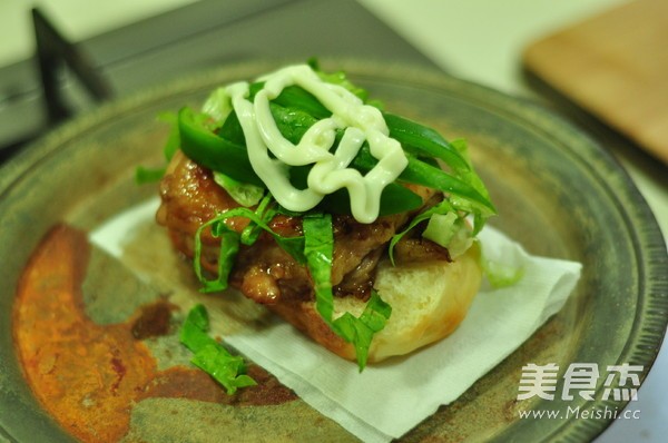 洋葱圈、番茄酱、芝士片和面包盖,照烧鸡腿堡放生菜、青椒、色拉酱和鸡腿即可