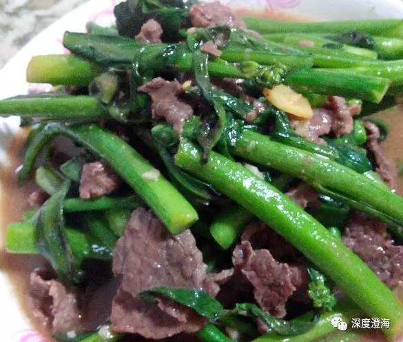 热锅下油,下牛肉,翻炒至牛肉变色 下芥兰,翻炒几下。下1碗水(最好是开水),煮开,依个人口味调味,加入生粉水勾芡至汁水变浓稠。